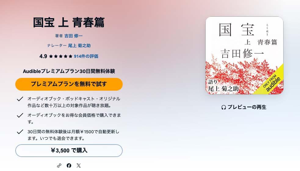ちなみに「国宝」は上・下巻があるので、オーディブルでそれぞれを単品購入した場合の合計金額は7,000円です!