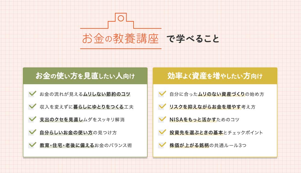 『お金の教養講座』では、正しい家計管理のやり方から、資産運用の基礎までを無料で学ぶことができます。